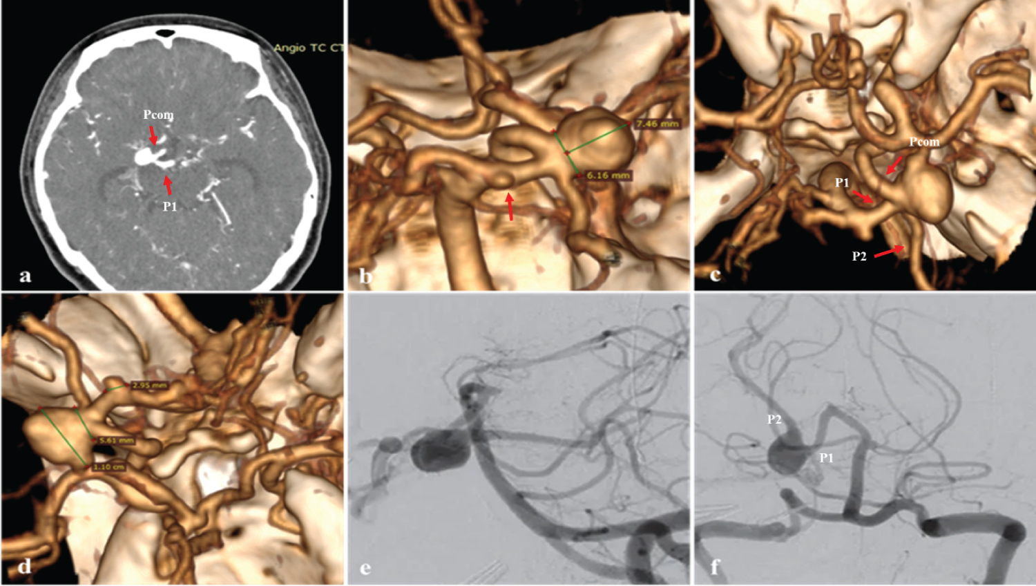 Figure 1: (a, b, c and d) 3D CT angiography of the arteries at the base of the skull to observe the aneurysm in the posterior cerebral artery. a) Axial section shows aneurysm at the P1/Pcom junction (red arrow);b) Posterior view, microaneurysm at the top of the basilar artery (arrow); c) Superior view, aneurysm at the P1/P2/Pcom junction, fetal posterior communicating artery (arrow); d) Right lateral view, dimensions of the aneurysm in the PCA; e, f) Digital subtraction angiography, right P1/P2 segment aneurysm.