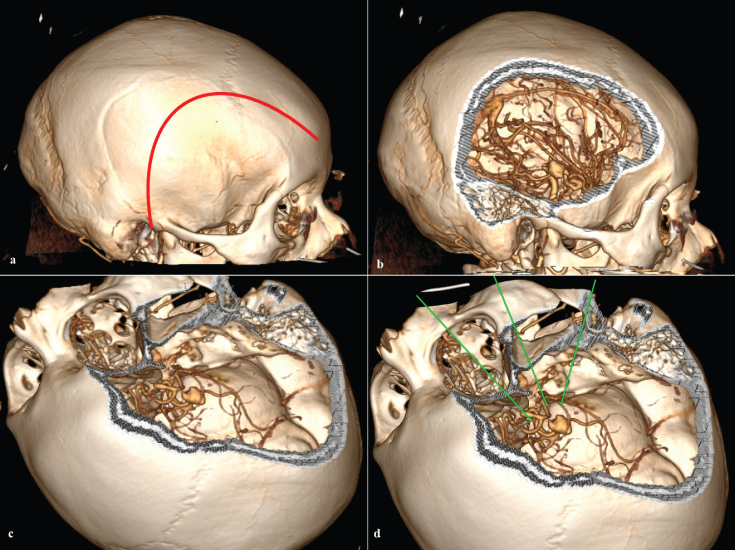 Figure 2: 3D tomography. a) Frontotemporal skin incision (red line); b) Right lateral view of right frontotemporal craniotomy; c) Surgical position and craniotomy with zygomatic frontotemporal enlargement; d) Surgical position and access corridors to the aneurysm (green line).