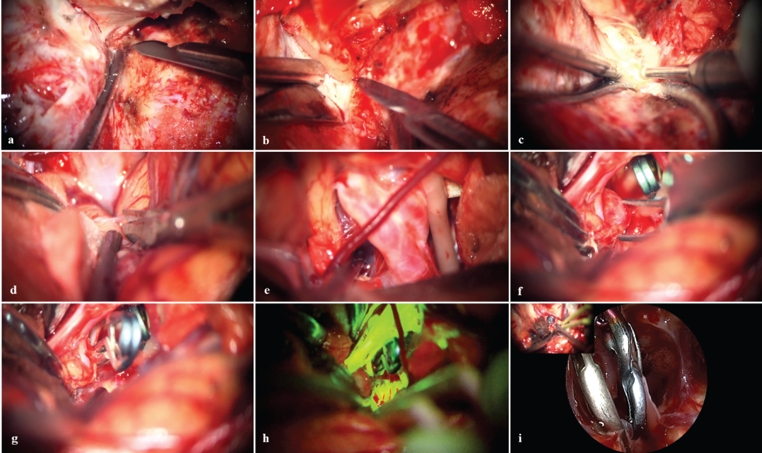 Figure 3: Microsurgical vision. a) Exposure of the sphenoid wing and posterior drilling; b) Mini-peeling of the middle fossa; c) Anterior extradural clinoidectomy; d) Wide opening of the Silviano valley; e) ACI-III bifurcation nc; f) Temporary clipping in basilar artery; g) Clipping and exclusion of P1 aneurysm; h) Fluorescein videoangiography corroborates P1-P2 exclusion and patency; i) Endoscopic visualization confirms patent branches adjacent to the neck.