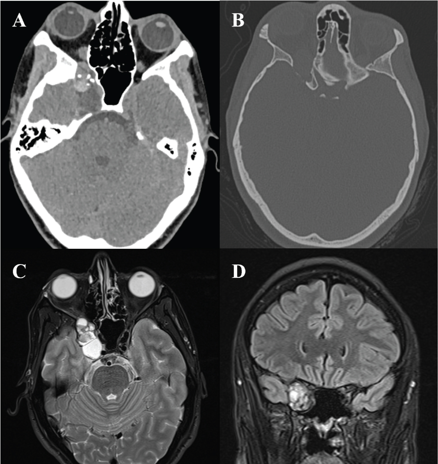Figure 1: A) Axial non-contrast CT demonstrating the mixed density lesion centered within the orbital apex with hyperdense components posteriorly likely representing hemorrhage and scattered calcification; B) Axial CT bone window demonstrating smooth bony remodeling and expansion; C-D) T2-weighted axial; C) Coronal; D) MRI demonstrating a 3.8 × 1.8 × 2.7 cm hyperintense cystic mass centered within and causing widening of the superior orbital fissure, extending through the annulus of Zinn and into the right posterior orbit.