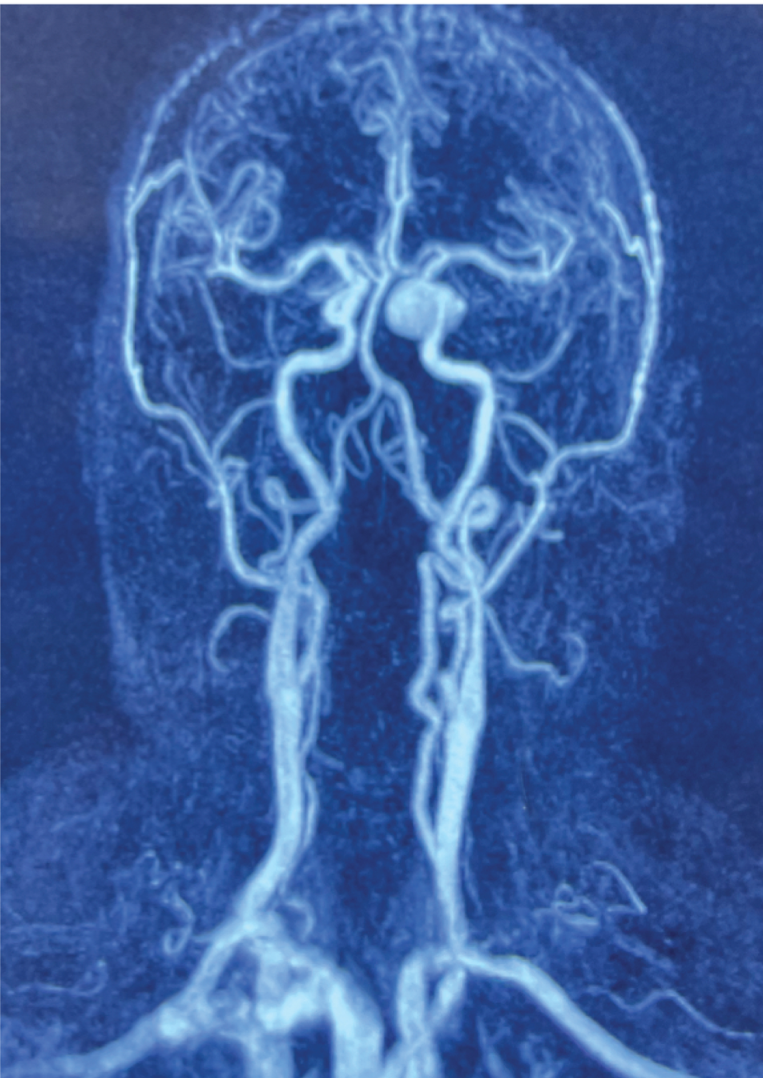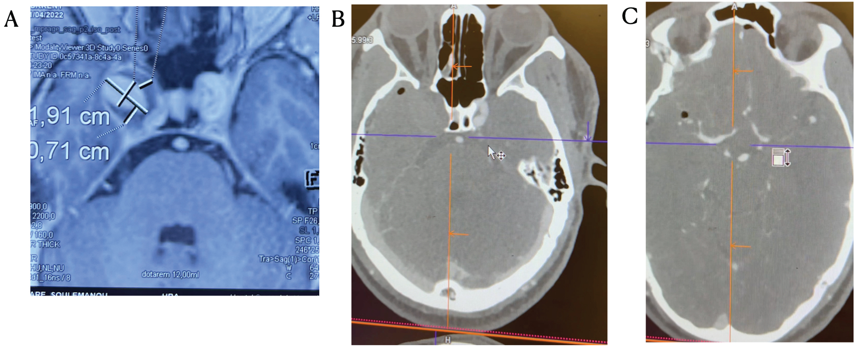Figure 1: (A) Right ICA aneurysm of the cavernous sinus causing diplopia; (B) Postoperative CTA showing a completely thrombosed aneurysm and ICA on the right side; (C) The ICA and intracerebral circulation distal of the clip is completely intact as can be seen on the MCA and ACA the right side.
