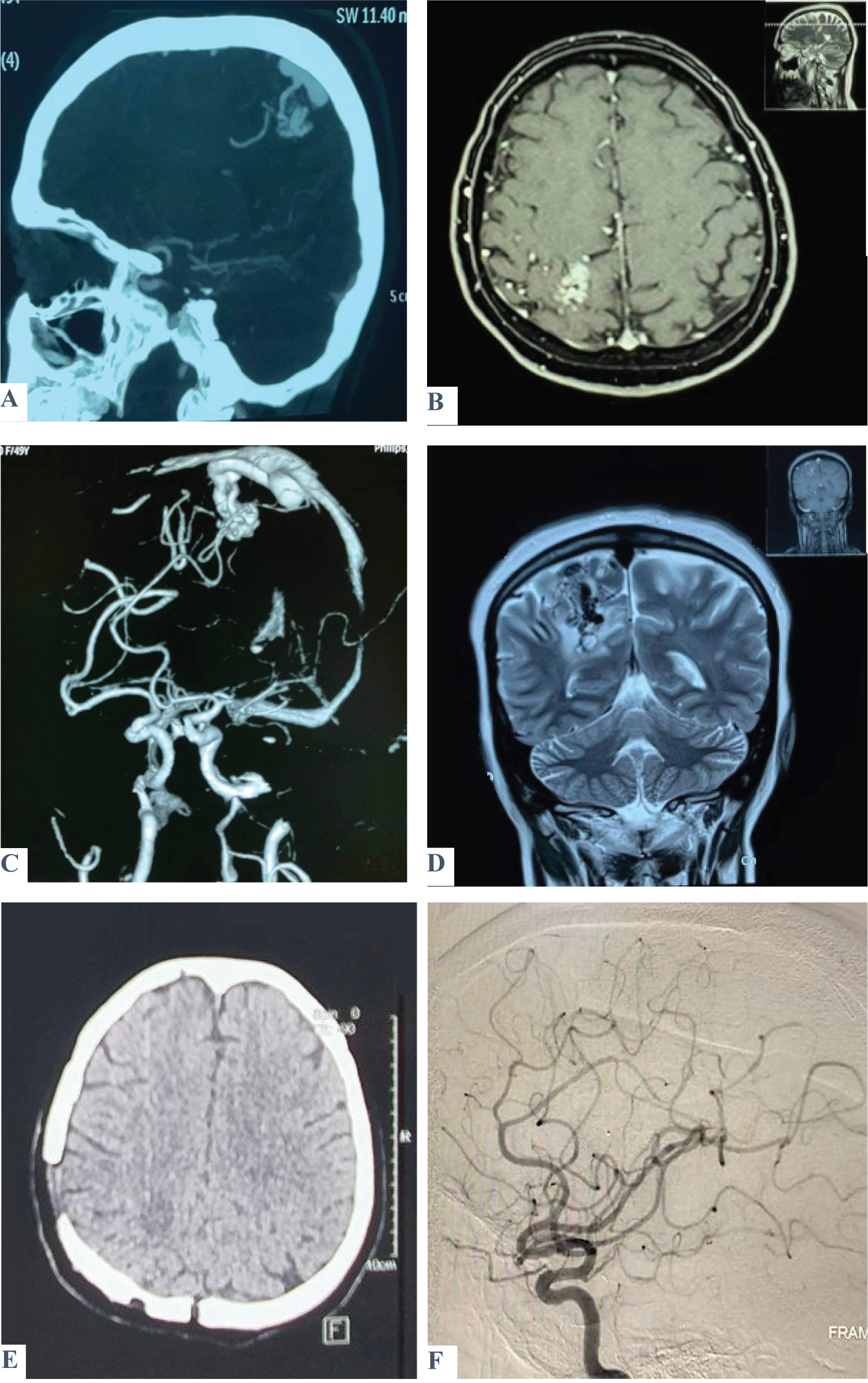 Figure 2: Shows a case of a 49-year-old female patient presented with three attacks of seizures. On admission, GCS was 15, with no fit, no vomiting, and no motor or sensory deficit. A brain CT scan (A) and MRI (B) show a heterogenous lesion within the posterior part of the Rt. parietal lobe involving the sensory area consistent with AVM, which was confirmed by MRA (C) and MRV (D). Post-operatively, GCS was 15 with no fit or vomiting. There was left-lower limb weakness but relieved on successive days. A postoperative brain CT scan and DSA revealed total excision of the lesion (E & F).