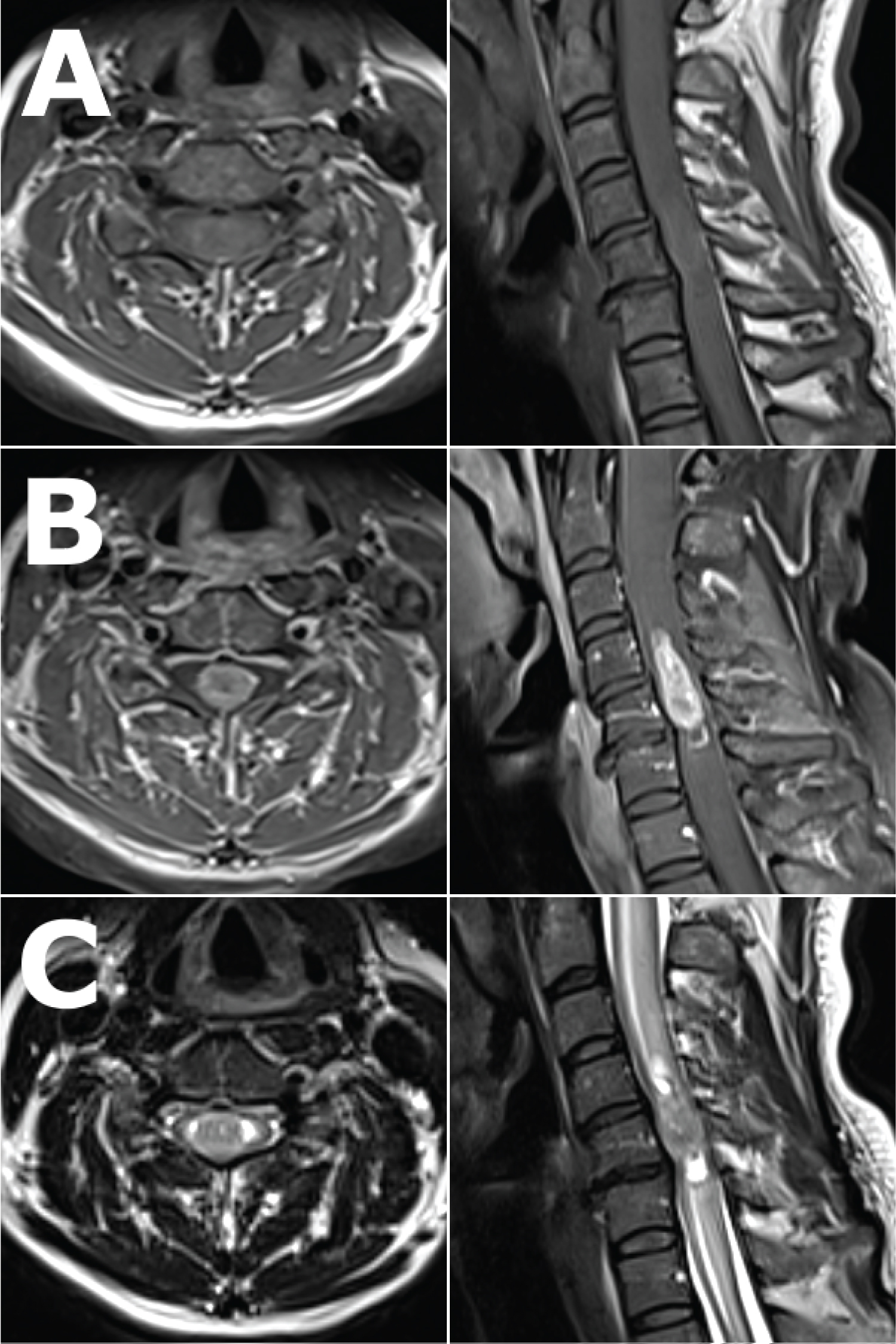 Figure 1: Pre-operative axial (left) and sagittal (right) views of the cervical spine MRI showing the lesion. T1 weighted images, A) pre and B) post- Gadolinium enhancement, showing a well-defined, T1 isointense but homogenously enhancing intramedullary lesion from C4 to C6, occupying most of the spinal canal at the level of C5. C) T2 weighted images showing the same lesion, which is T2 isointense with tiny spotty T2 hyperintensities within, splaying the normal spinal cord circumferentially around it at the level of C5, with associated syringomyelia most evident at the superior and inferior ends of the lesion, and with marked associated spinal cord oedema as evidenced by T2 signal change from C1 to T1.