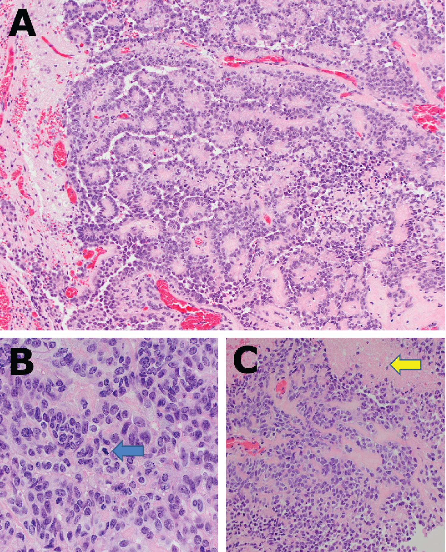Figure 2: A) Cellular neoplasm composed of oval to columnar cells with hyperchromatic apically placed nuclei, variably prominent central nucleoli and a moderate amount of eosinophilic cytoplasm are arranged in papillary structures and perivascular pseudorosettes. H&E x20; B) Frequent mitoses: 3-5 per 10 high power fields (blue arrow) H&E x40; C) Multifocal coagulative necrosis (yellow arrow), H&E x20.