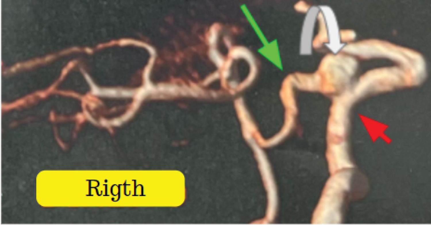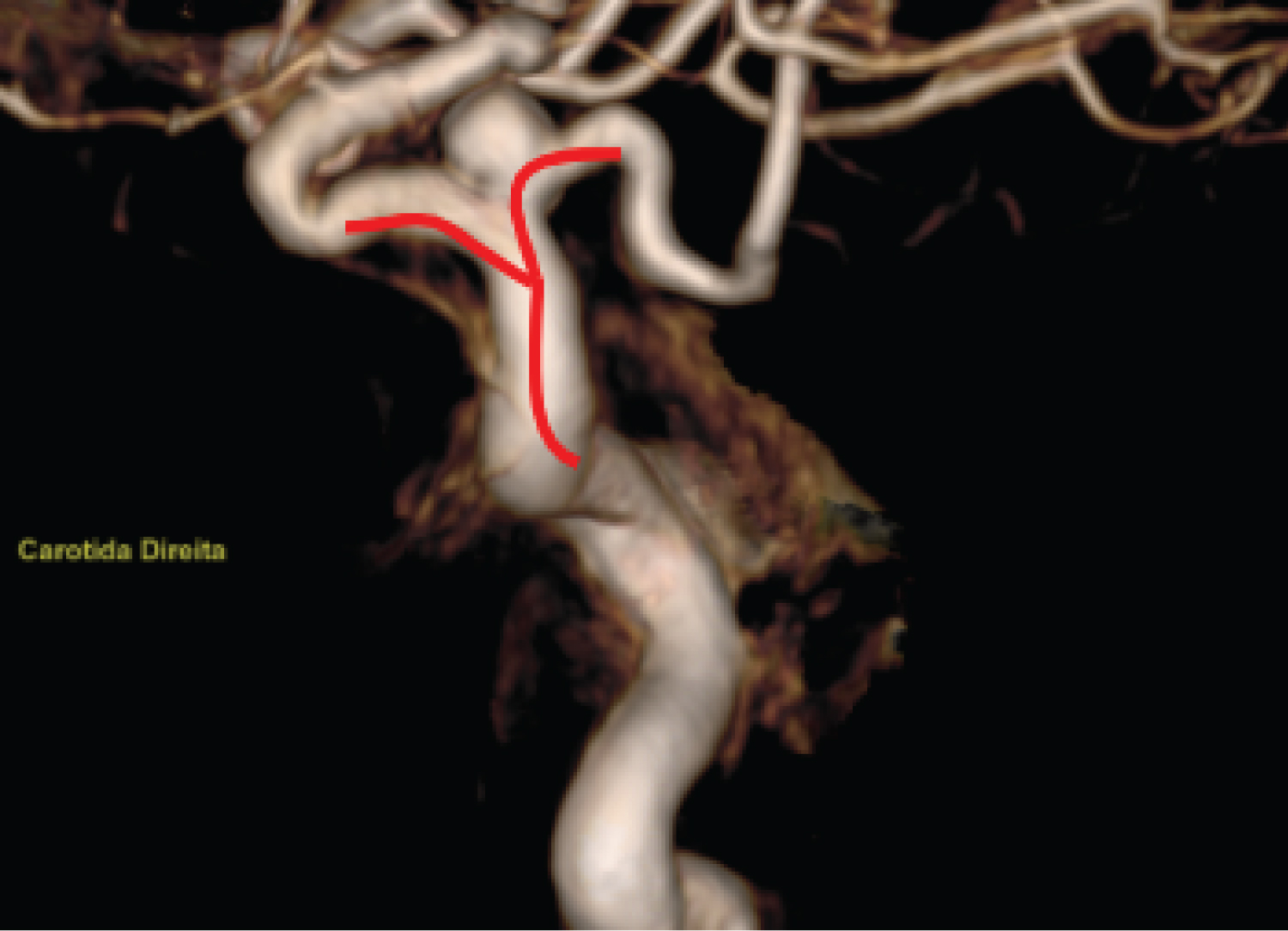 A.L.L.S., woman, 53-years-old, with a history of headache and previous clipping of an unruptured cerebral aneurysm of the Anterior Communicating Artery (AcoA) in 2018. During follow-up, she underwent Magnetic Resonance Angiography (MRA) 3D-TOF of cerebral vessels, which demonstrated a saccular aneurysm in the cavernous segment of the right Internal Carotid Artery (ICA), measuring 5.9 mm in its largest diameter and with a neck of 4.8 mm (Figure 1). This lesion is associated with the presence of a Persistent Primitive Trigeminal Artery on the right (PPTA), which arises immediately proximal to the aneurysm (aneurysm orientation).