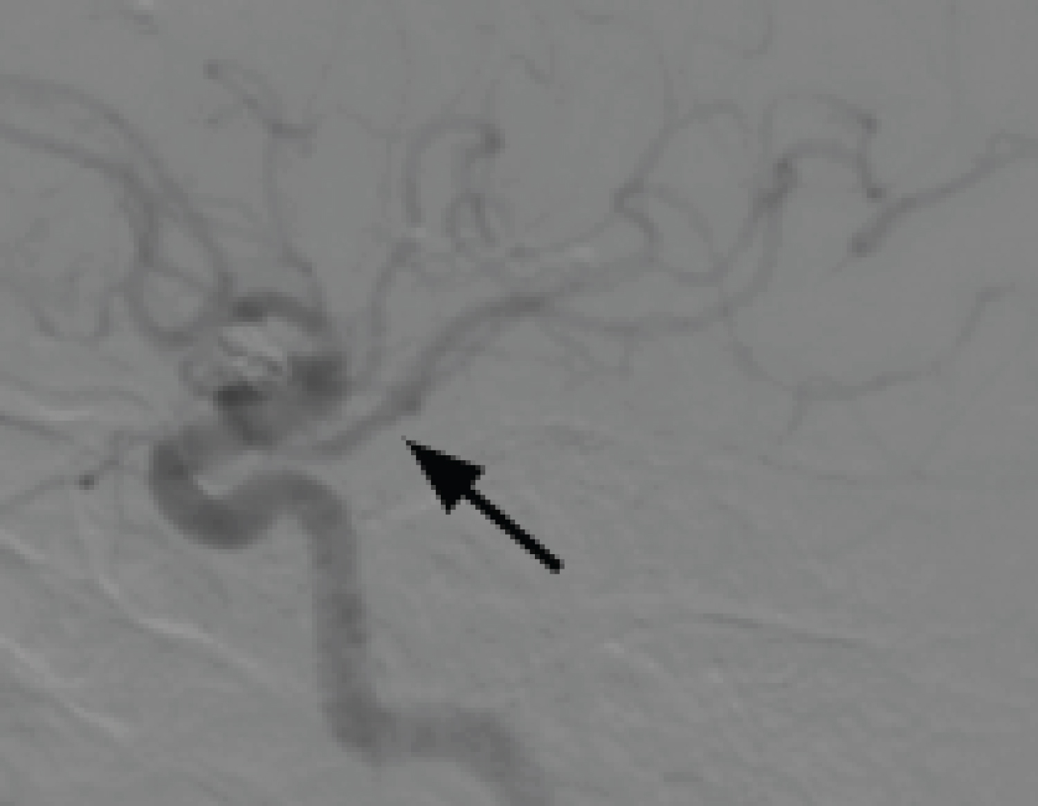Figure 3: Profile view of left internal carotid artery arteriography (ACIE), arterial phase, black arrow indicating fetal-type left posterior communicating artery (P-com).
