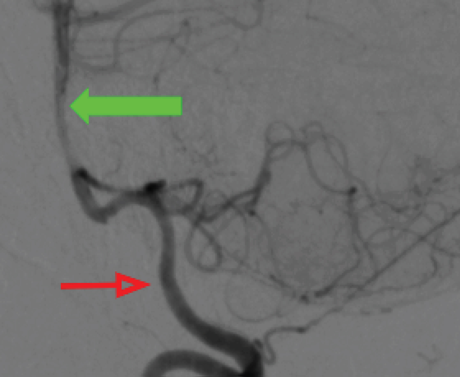 Figure 4: Dominant left vertebral arteriography in profile, arterial phase (red arrow), filling the basilar artery (green arrow).