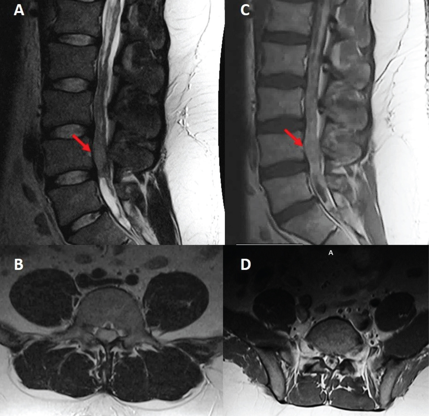Figure 1: Sagittal (A) and axial (B) T2, sagittal (C) and axial (D) T1 post-contrast MRI sequences demonstrating an intradural and extramedullary lesion centered at the L4 level of the lumbar spine (red arrows).