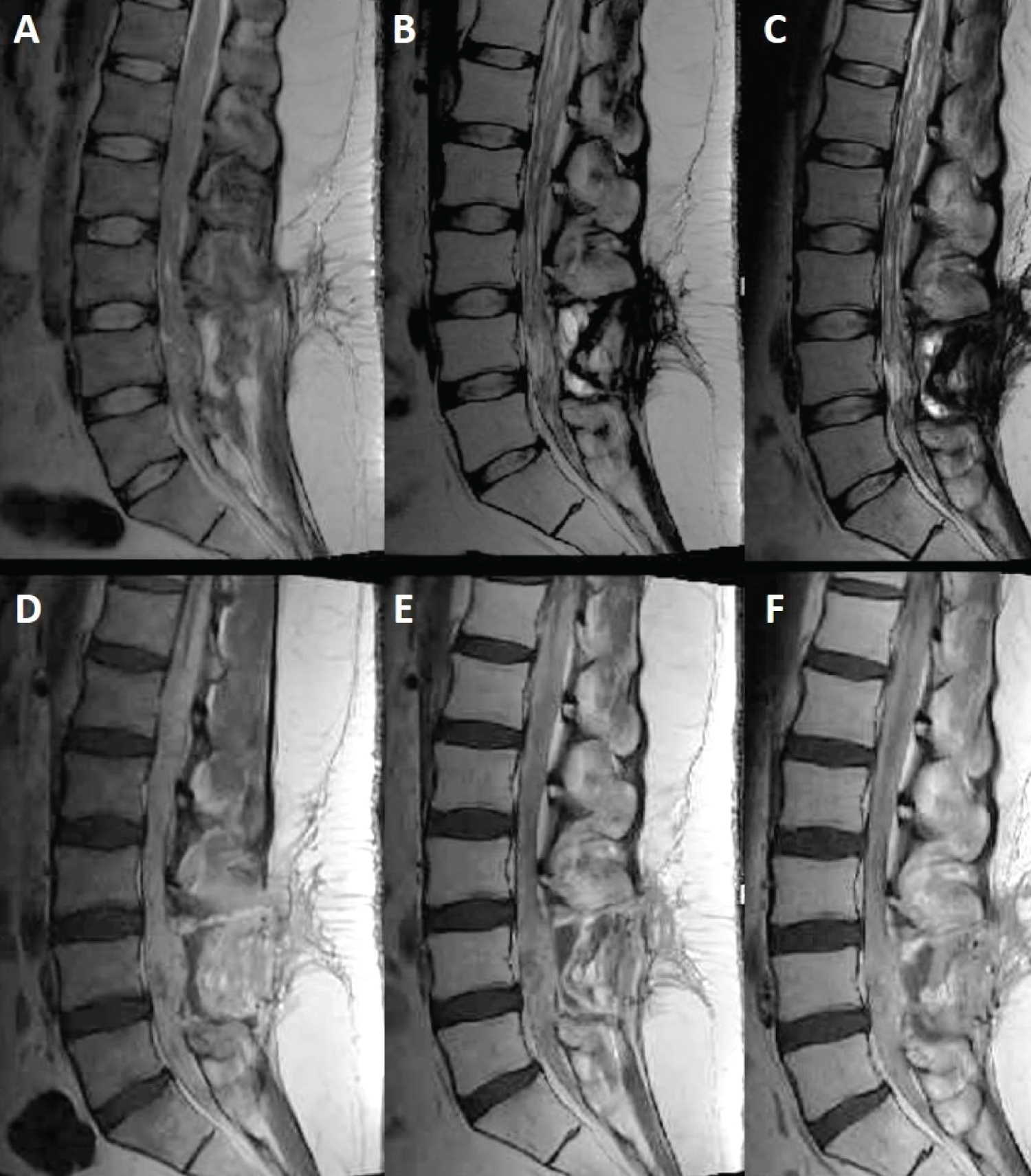 Figure 2: Sagittal T2 (top row) and T1 post-contrast (bottom row) MRI sequences demonstrating lesion progression at 1 month (A,D), 4 months (B,E) and 6 months (C,F) post-operatively.