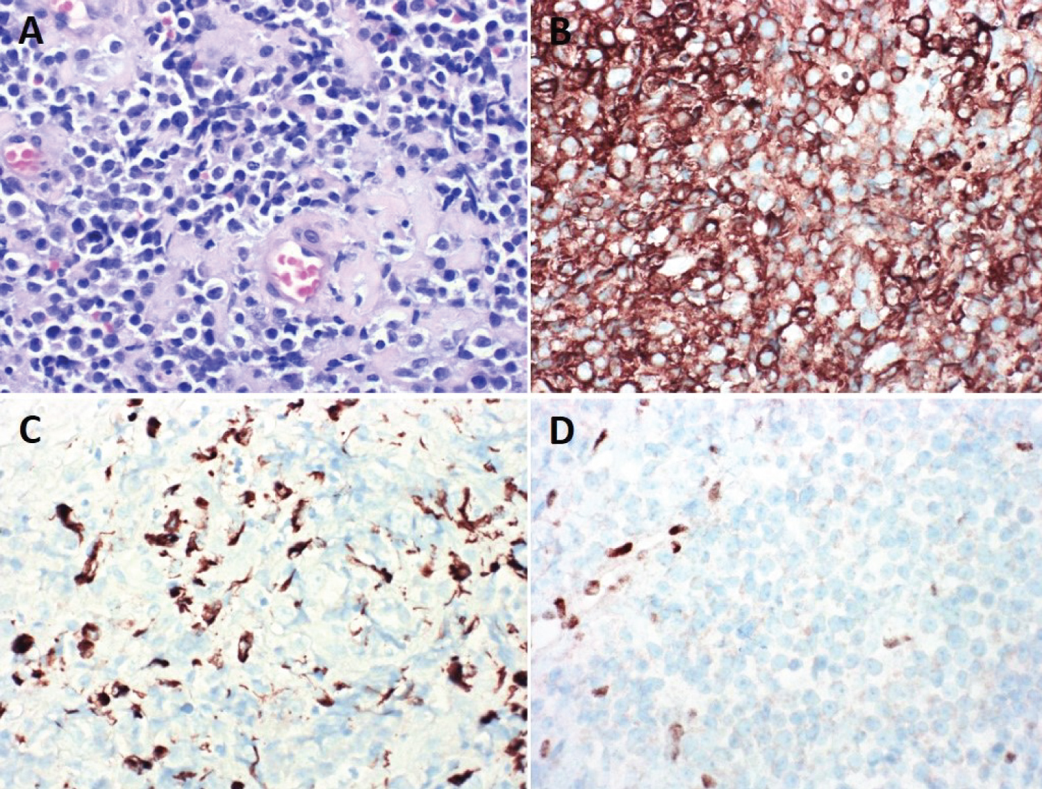 Figure 3: A) Microscopic and immunohistocytochemistry pathology analysis of the tumor sample (40x magnification) - H&E; B) Smooth muscle actin; C) Cytokeratin CAM5.2; D) INI1.