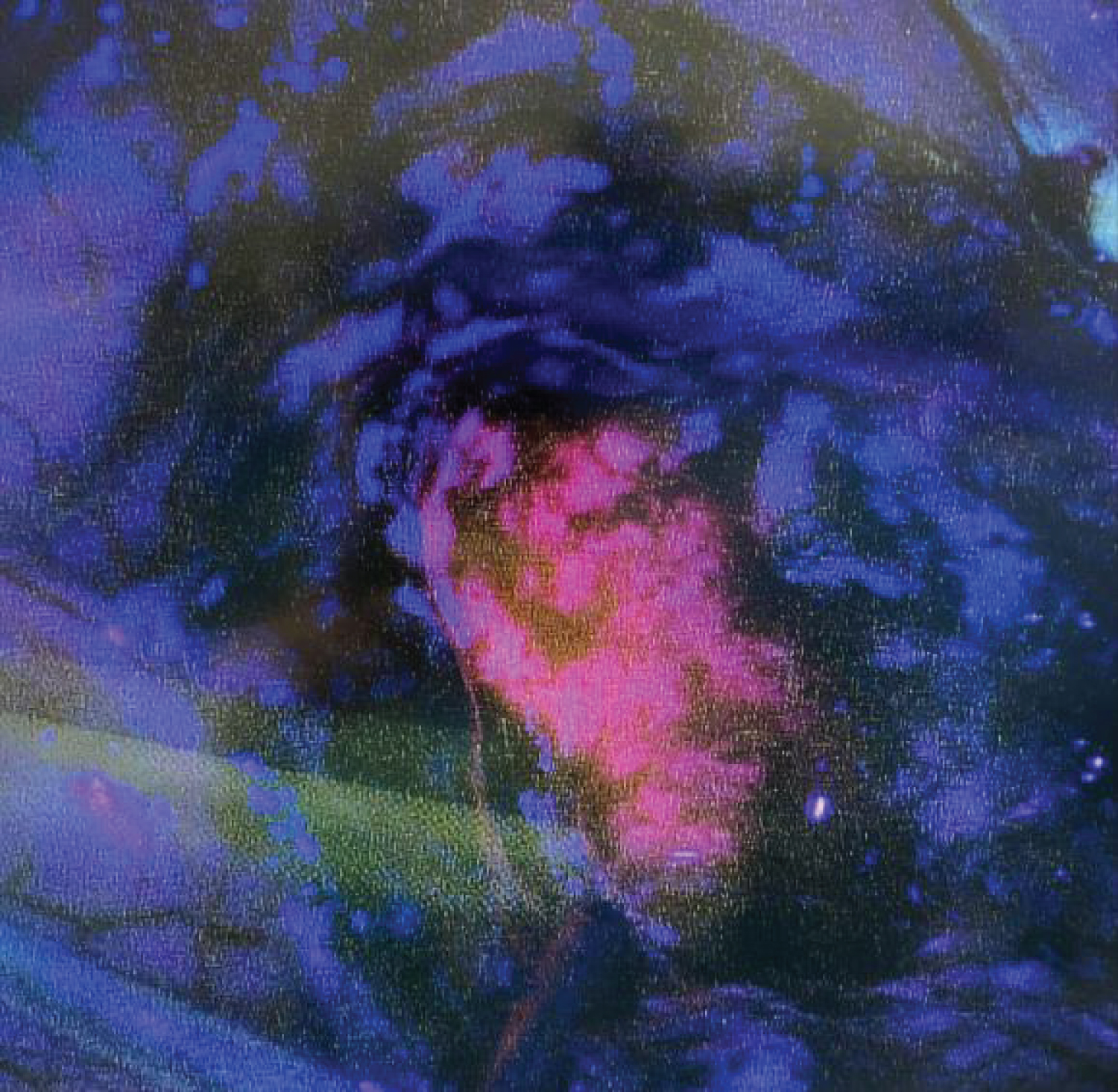 Figure 1: Per-operative view of the GBM in pink in contrast to non fluorescent surrounding brain parenchyma in blue.