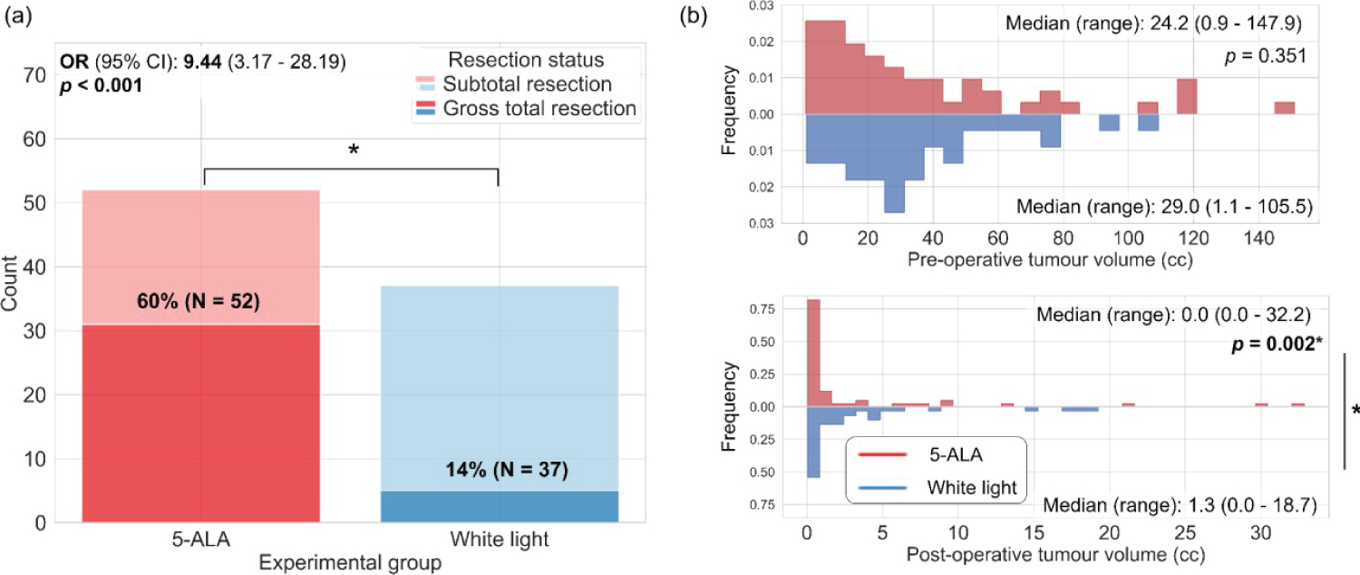 Figure 2: 5-ALA significantly improves GTR rates and median postoperative tumour volume compared to traditional white-light surgery. (a) Counts of patients achieving GTR in the 5-ALA group (red) vs. the white light group (blue) (p < 0.001; OR = 9.44 (3.17 - 28.19)); b) Preoperative (top) and postoperative (bottom) tumour volume distributions for the 5-ALA (red) and white light (blue) groups. The difference between postoperative tumour volumes across groups was significant (p = 0.002).
