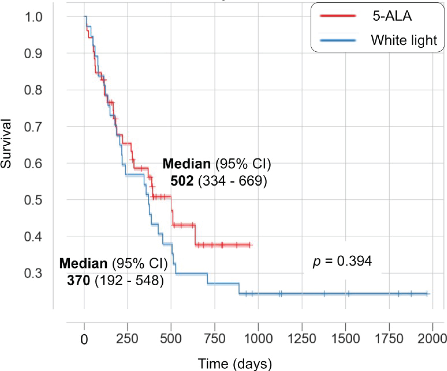 In our cohort, we were not able to find a statistically significant difference in survival benefit from 5-ALA compared to conventional white light surgery (p = 0.394; Figure 3), although we observed a slight trend towards longer survival in the 5-ALA group. In the 5-ALA group, the median survival was 502 days (95% CI 334-669; 26/52 patients censored) compared to 370 days (95% CI 192-548; 9/37 patients censored) in the white light group.