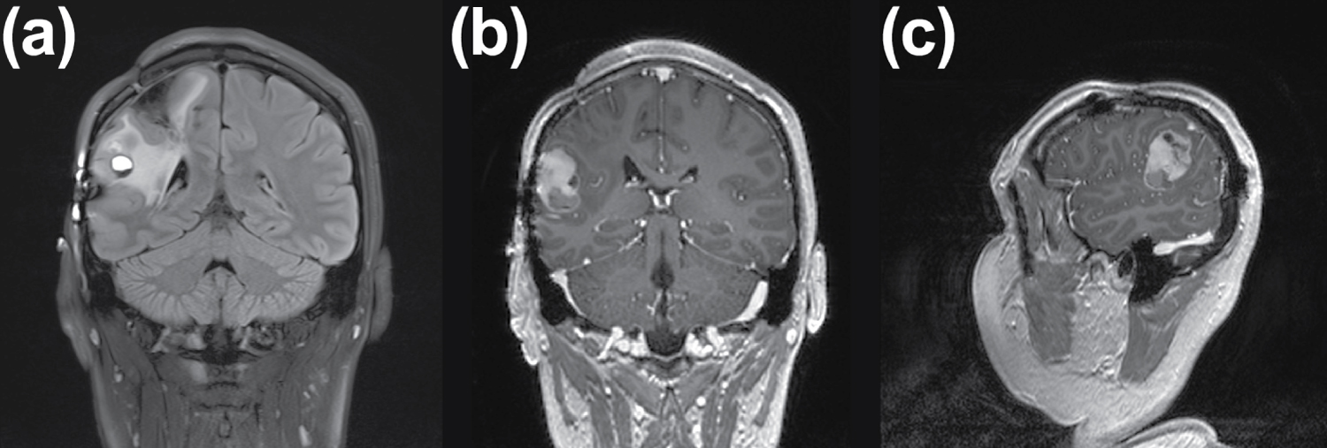 In May 2023, MRI revealed tumor recurrence involving the surgical bed, posterior insula, superior temporal gyrus, and supramarginal gyrus, measuring 4 × 4 × 4 in size, as depicted in Figure 1 and Figure 2.