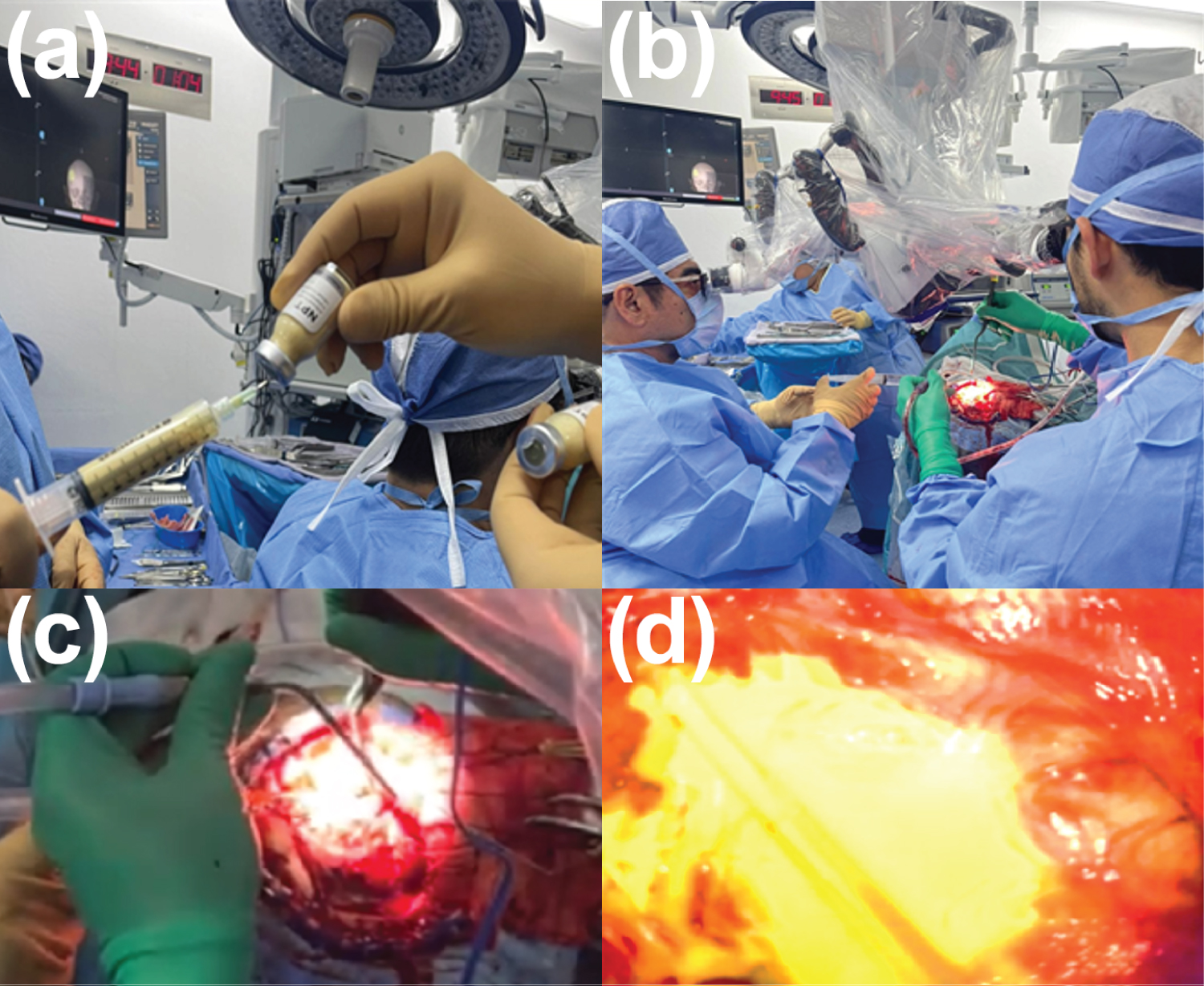 Figure 3: Surgical Deposition of Ultra-NPt Bionanocatalysts in the Tumor Bed after Resection. a) Preparation of ultra-npt Bionanocatalysts; b) Administration of Ultra-NPt Bionanocatalysts; c) Tumor bed exposed for incorporation; d) Tumor bed covered with Ultra-NPt bionanocatalysts.
