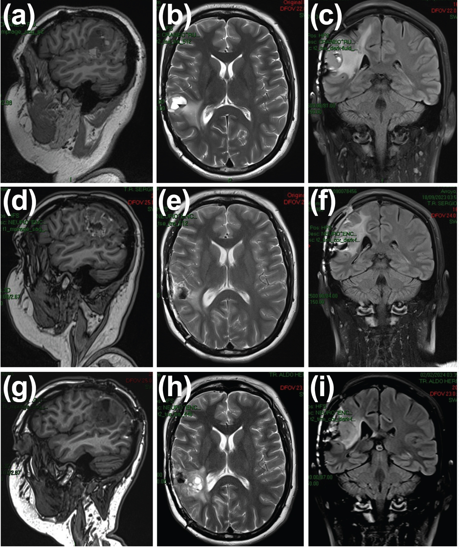 Figure 4: MRI of the cerebellum. May 2023. a) Sagittal section in T1 sequence; b) Axial section in T2 sequence; c) Coronal section in T2 FLAIR sequence. September 2024; d) Sagittal section in T1 sequence; e) Axial section in T2 sequence; f) Coronal section in T2 FLAIR sequence. February 2024; g) Sagittal section in T1 sequence; h) Axial section in T2 sequence; i) Coronal section in T2 FLAIR sequence.
