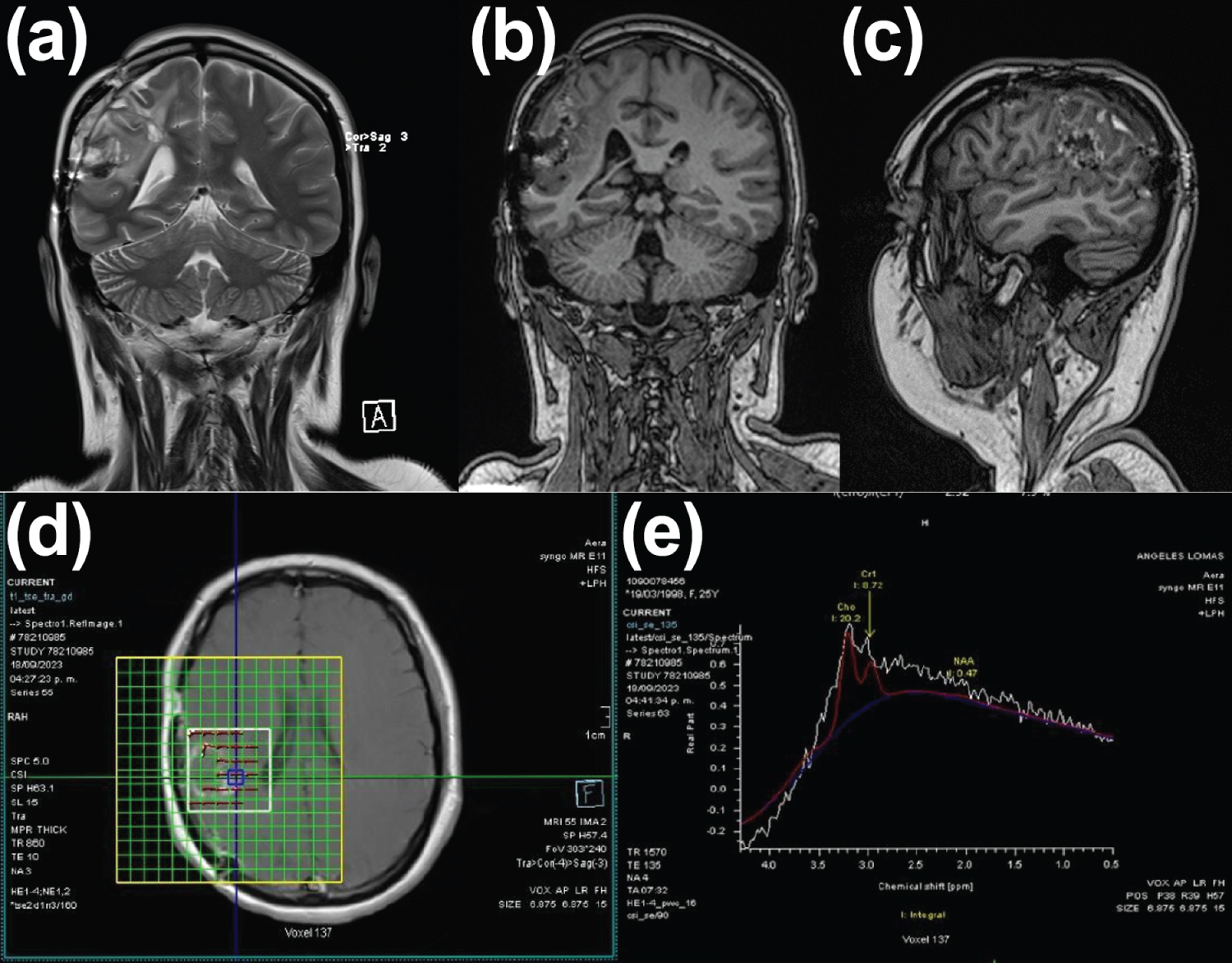 Notably, a simple and contrasted skull MRI of September 2023 displayed postoperative changes in the right postcentral and supramarginal gyrus, with hematic debris in the surgical bed expected for the postoperative period, along with perilesional edema assessed in T2/FLAIR sequences. Minimal diffusion restriction and high ADC values were observed in the surgical site. Heterogeneous, linear, and diffuse uptake was evident in the surgical bed on T1+Gad images, as expected for the postoperative period. Multivoxel MRS revealed a choline peak and decreased NAA (Figure 5).