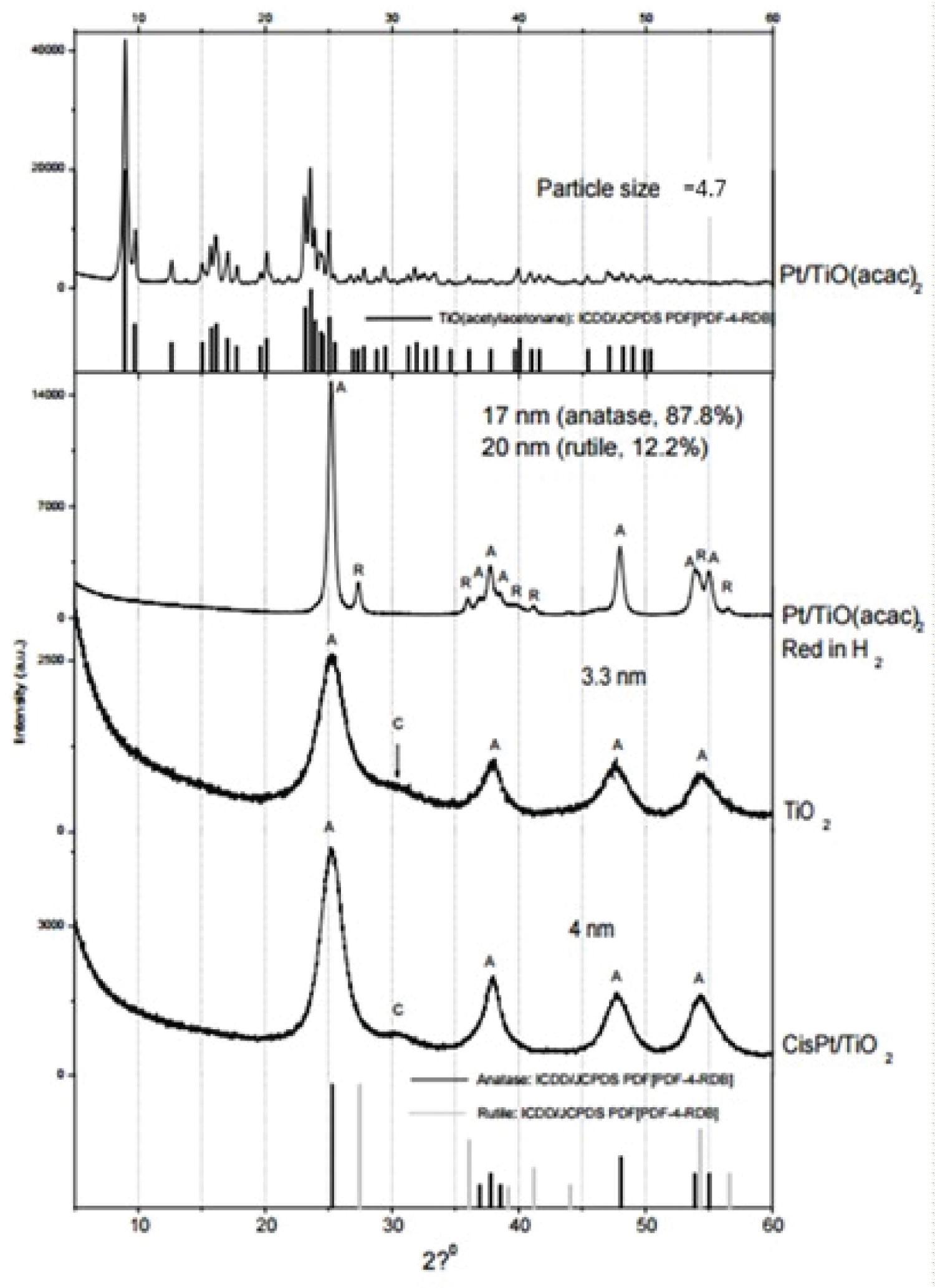 Additionally, the introduction of transition metal ions during synthesis typically influences the phase transformation behavior and structure of TiO2 [20]. Figure 8 displays diffractograms of the samples. All platinum/titania samples exhibited a single peak at 27.44 (2θ) corresponding to the anatase (1 0 1) phase. Notably, only anatase peaks were observed in ultra-NPt supported on functionalized TiO2 samples. The nanostructured titania reference also displayed an anatase pattern.