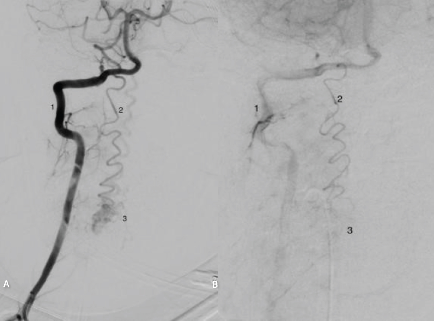 Figure 2: Intra-procedural DSA. (A) Before treatment; (B) Post-glue embolisation shows the obliteration of AVM (3).