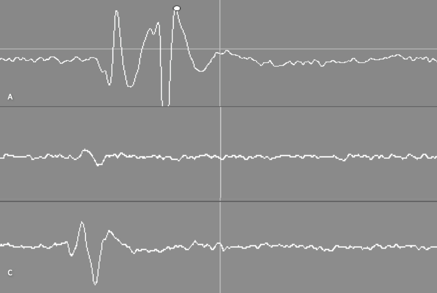 Figure 3: Intraoprocedural MEPs. (A) Shows MEPs baseline before the start of procedure; (B) Iintraprocedural MEP Amplitude loss > 50%; (C) MEPs at the end of the procedure.