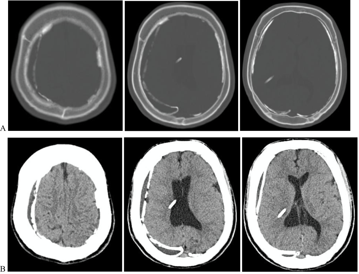 Figure 1: Non-contrast head computed tomography, A-Bone and B-Brain windows on axial computed tomograph imaging of the head demonstrating billateral calcified chronic subdural hematomas, and a non-dilated ventricular system.