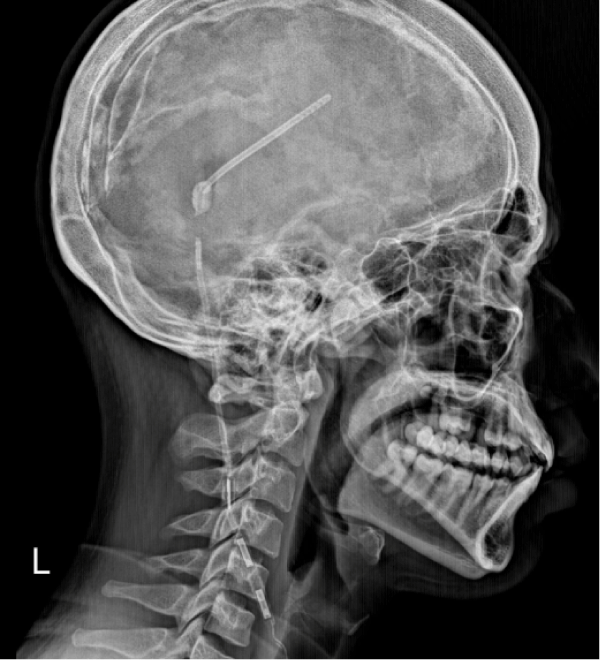 Figure 2: Lateral skull X-ray (right profile) showing a disconnection of the shunt system.