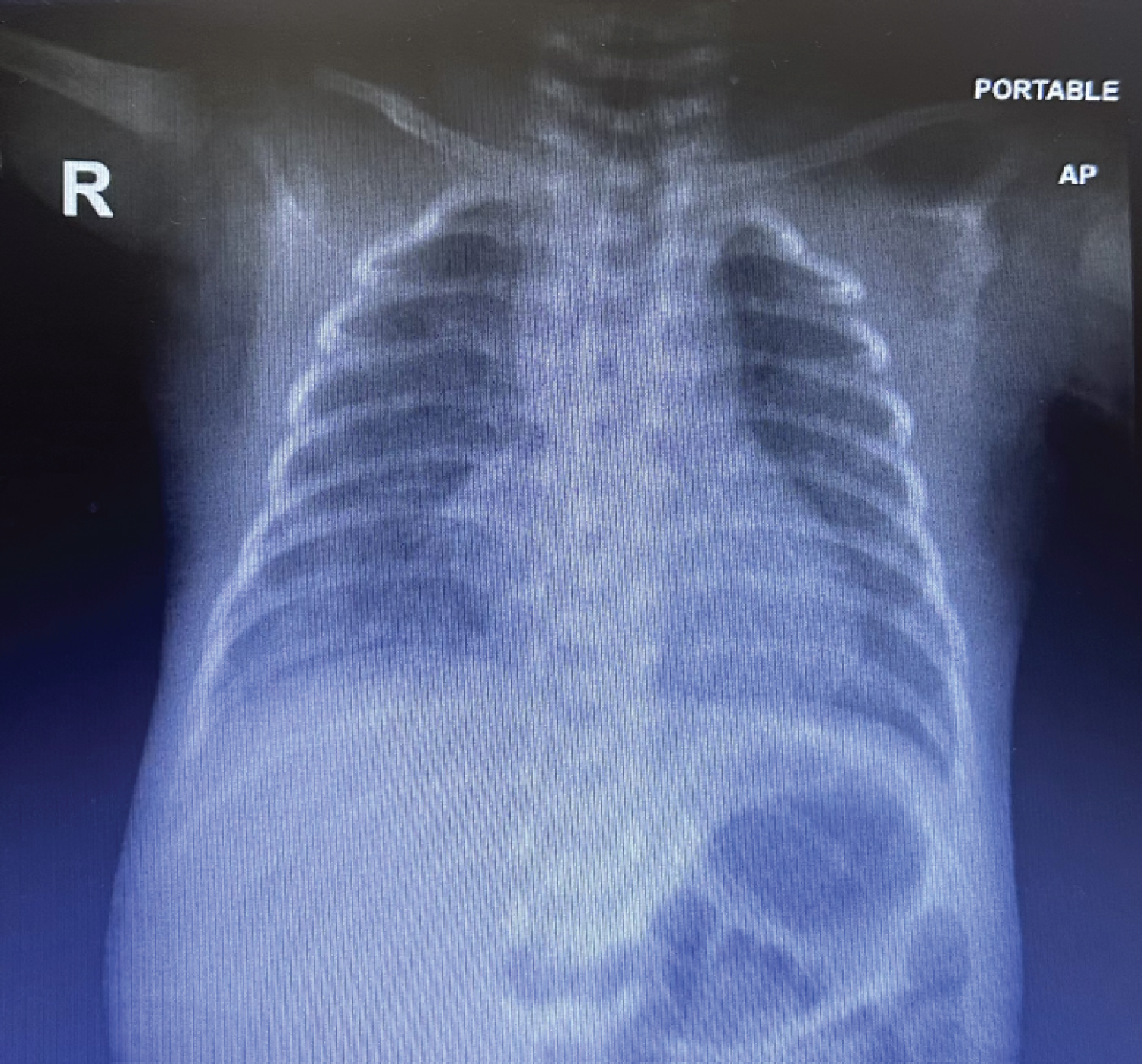 A female preterm neonate weighing 1900g was born via cesarean section due to fetal distress at a gestational age of 32 weeks. Mother is a G2P1A0 who had a history of fever 4 days prior to delivery. In the laboratory investigation of the mother, C reactive protein of 29 mg/L (High) was detected, she was started an empirical treatment of ceftriaxone and metronidazole after obtaining a blood culture. At delivery, meconium-stained amniotic fluid was noted. APGAR 7, 8 and 9, at 1 st , 5 th and 10 th minute of life, respectively. In view of respiratory distress, patient was started on CPAP PEEP 6-7 cm water then transferred to the neonatal intensive care unit (NICU). Physical examination on admission revealed mildly depressed activity, mild generalized edema and poor peripheral perfusion, tachypnea, and subcostal retractions.