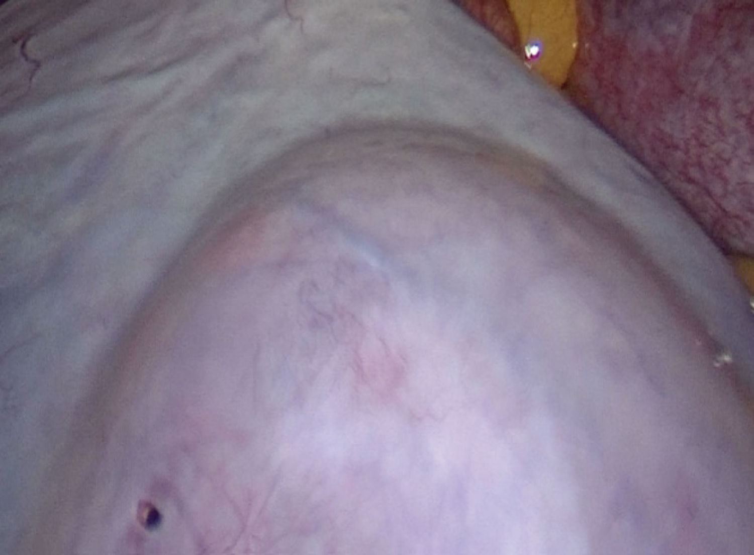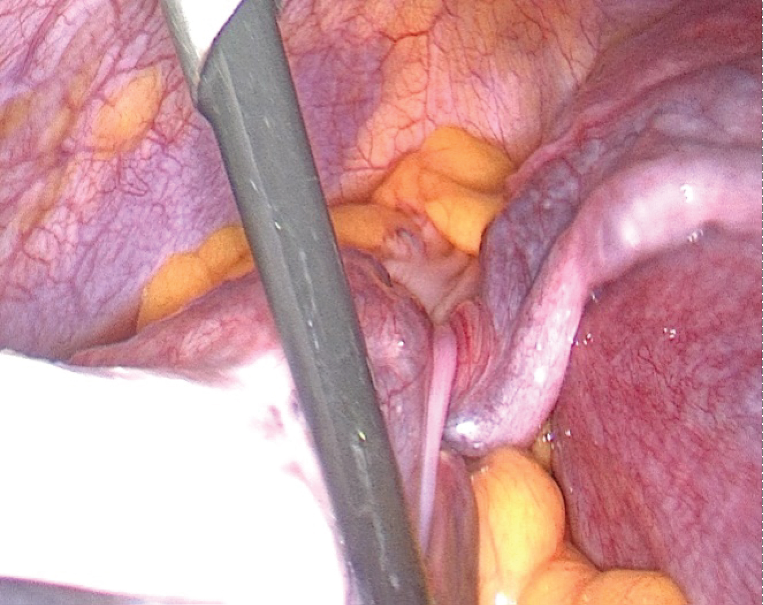 When we were faced with a patient who was in severe pain, we decided to perform a diagnostic laparoscopy. Exploration revealed a large functional cyst measuring 15 * 10 cm (Figure 1). The fallopian tube was twisted with three turns of the spiral (Figure 2) and an epiploic appendigitis (Figure 3). After evacuation of the cyst, a detorsion was performed. Yellow fluid was obtained, confirming the functional origin of the cyst, followed by resection of the epiploic appendigitis. Postoperative follow-up was favorable and the patient was discharged one day later. The ultrasound after 2 weeks showed an evolving pregnancy.