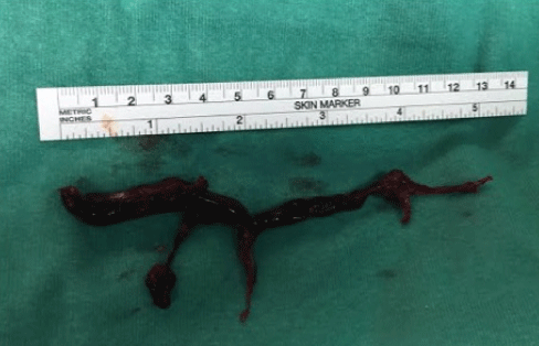 A 42-year-old gravida 1, 40-weeks' gestation, presented with rupture of membranes in labor. Her history and prenatal care were unremarkable except for obesity. On physical examination, blood pressure was 156/91 mmHg with no other signs of pre-eclamsia. Due to non-progression at active labor, cesarean section was performed with extended "top-up" epidural and delivery of a healthy boy. Immediately after removal of the placenta, the patient reported chest pain, and became unresponsive. ECG (electrocardiography) demonstrated asystole. The trachea was intubated, and cardiopulmonary resuscitation had begun, with closed chest compressions and administration of vasopressors. After 12 minutes of rigorous resuscitation spontaneous pulse returned. Abdomen was closed quickly with no active bleeding. Trans-esophageal echocardiography demonstrated decreased right ventricle contractility. Mild consumption coagulopathy was treated with coagulation factors. Two hours later, patient's vitals deteriorated and her blood pressure dropped despite continuous vasopressors use. At that time, as the woman was no longer hemodynamically stable, decision of re-laparotomy with hysterectomy was made followed by connection to venous-arterial extracorporeal oxygenation (VA-ECMO) support. The next day, after hemodynamic stabilization was achieved, CT angiography scan revealed a filling defect in the right pulmonary artery and open thoracotomy with excision of a 12-cm clot from the right pulmonary artery (Figure 1) was performed. After surgery, the patient's cardiac function gradually improved and she was weaned off the ECMO. Twenty-nine days later, she was discharged to rehabilitation center, neurologically intact. Histology of the thrombi revealed fetal debris that was compatible with amniotic fluid embolism (AFE) (Figure 2).