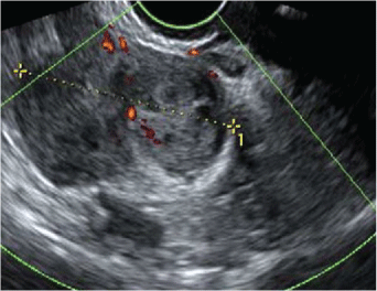 Figure 1: Ultrasonographic finding of intravascular leiomyoma: Right lateral uterine mass of 45 mm arising from the corpus uteri and partially vascularized. View Figure 1