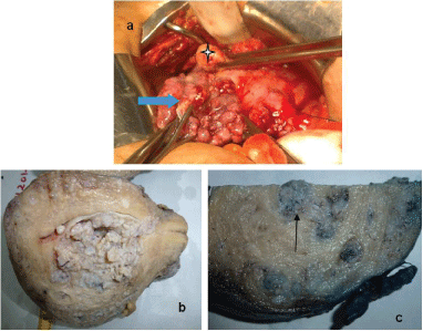 Figure 2: Macroscopic appearance of an intravascular leiomyomatosis; (a) Intraoperative view showing a large uterus with an encapsulated hyper-vascularized mass, developing on the right edge of the uterus (arrow) and an apparently normal ovarian (star); (b,c) View in section showing a large uterus with a small cavity, compressed by the wall, with multiple nodular formations (arrow). View Figure 2