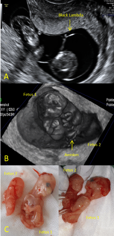 Figure 1: Biamniotic parasitic conjoined twins A) Ultrasound examination: Two amniotic sacs surrounding the conjoined twins, with the occurrence of a 'black lambda', which indicates the pregnancy to be monochorionic diamniotic (MCDA); B) Screenshot of three-dimensional virtual reality: Showing two amniotic sacs; C) Photo of the postmortem examination of the traumatically separated twins. View Figure 1