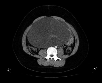 Figure S1: Axial CT image showing a multiseptated adnexal cyst with solid and cystic components as described in Case 2. View Figure S1