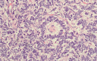 Figure 2: High power view of a cell block of the peritoneal fluid sample, showing round to ovoid GCT cells with a bland, focally clumped chromatin pattern, and occasional linear nuclear grooves (H&E x400). View Figure 2