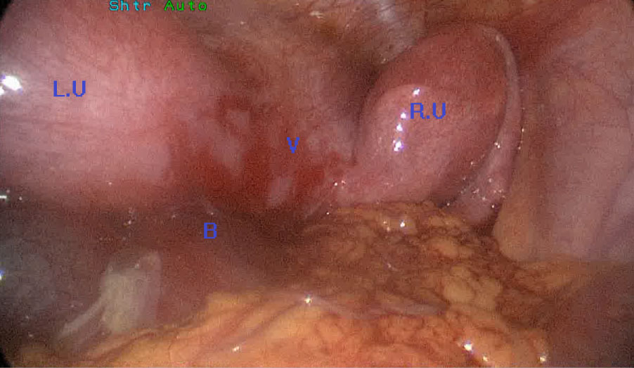 RU: Right uterus horne; LU: Left uterus horne; V: Vagina; B: Blood in the peritoneal cavity.