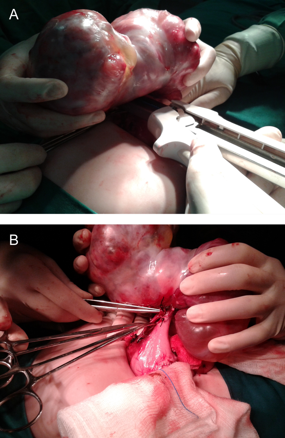 Laparotomy was performed with complete exéresis of a rich-looking tumour that has adhesions to the gastric minor curvature (Figure 2A and Figure 2B).