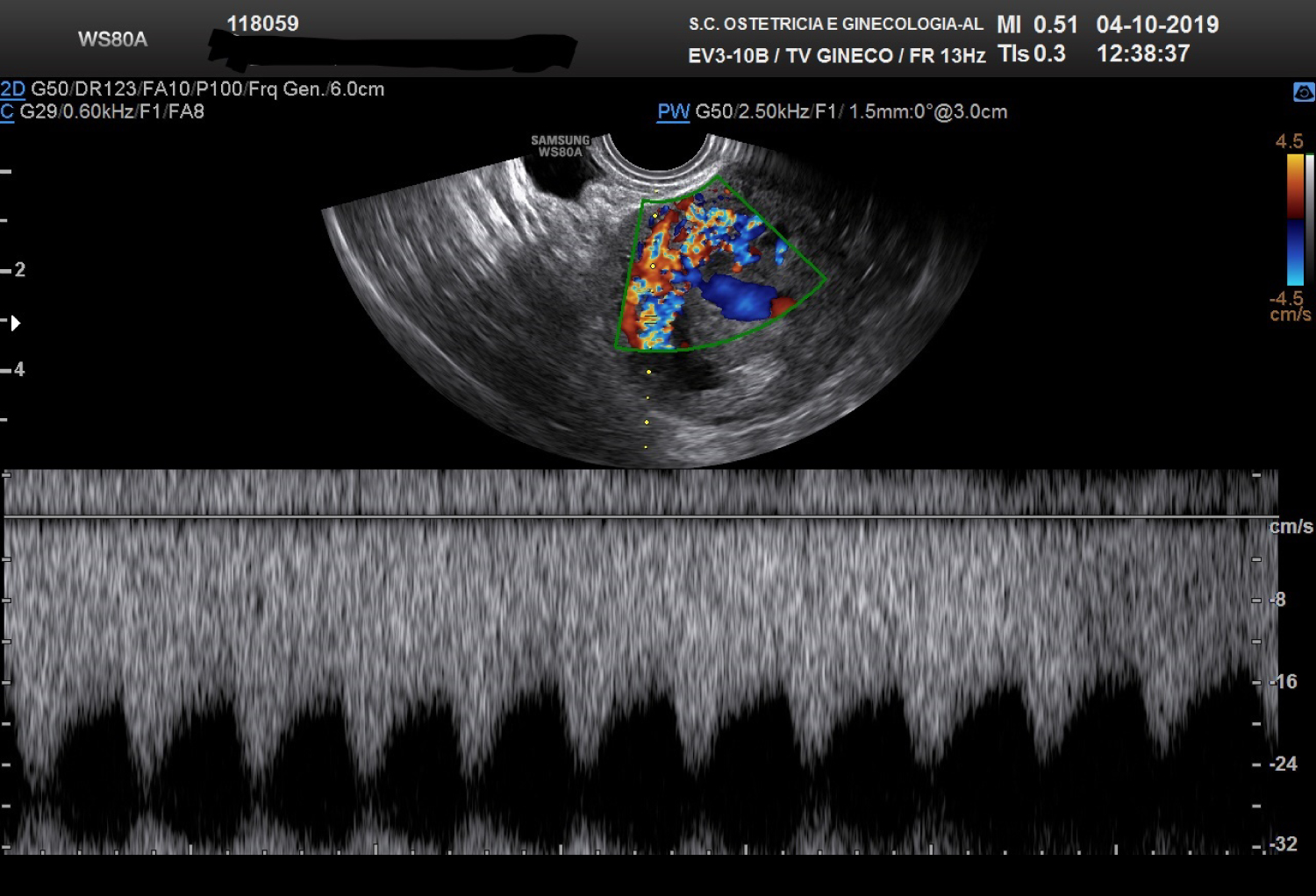 She had no menstrual period for 3 months until she went for a transvaginal ultrasound scan on October 2nd 2019, about three months after pregnancy termination. Beta-HCG assays showed values of 49.9 IU/L on September 6th, and of 30.7 IU/L on September 13th. Transvaginal sonography found a disomogeneous intrauterine mass with color score 3, suggestive of an intrauterine arteriovenous malformation. She was thus admitted to hospital on the day after. A second ultrasound scan was performed and the initial hypothesis was confirmed: A hypervascularized formation of about 30 mm was found inside the uterus. Its main feature was the presence of a low resistance arterial flow associated with large vessels with arterial pulsation (Figure 1). At admission the level of serum beta-HCG was of 8 IU/L, this excluded the hypothesis of a trophoblastic disease. On the days 5th and 6th of October she reported having some dark discharge which resulted in scarce vaginal bleeding.