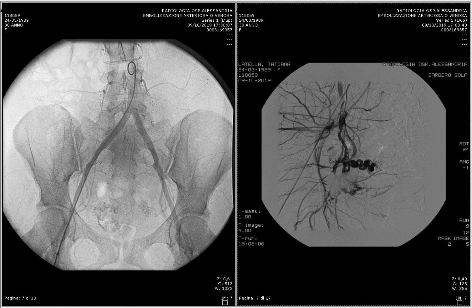 The patient was thereafter managed considering the diagnosis of UAVM. D&C was not performed for two main reasons: High risk of bleeding secondary to the hypervascularization of the uterine formation, high risk of developing further vascular anomalies in the hypothesis the patient were affected by HHT as her mother and her sister. On the 9th October the patient underwent embolization of the right uterine artery since the blood supply was found at angiography coming mainly from that artery (Figure 2). On the same day serum betaHCG were dosed on blood and the levels were undetectable.