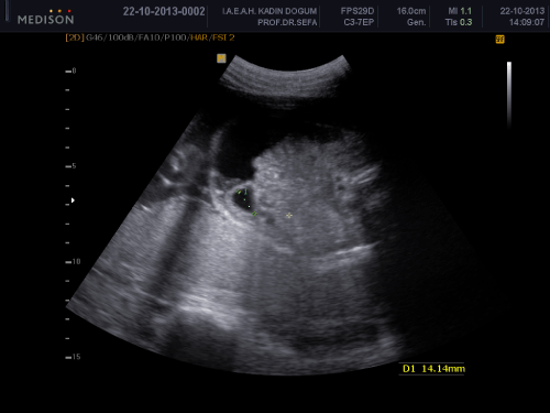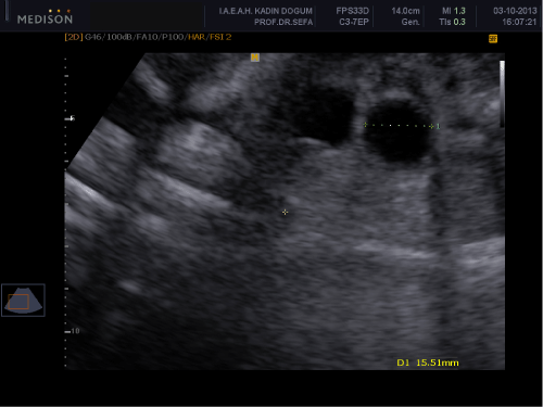 A 34-year-old woman, gravity 2, parity 0, abortion 1 is referred to our clinic at 32 weeks of gestation because of fetal intraabdominal cystic formation. She had an unremarkable prenatal course until this week. In history, she had no clinical significant coincident disease. We learned that she attended all prenatal visits regularly and she had no pathological finding in all previous visits. In the 32 weeks ultrasonography fetal biometric measurements were compatible with gestational age, amniotic fluid volume was in normal limits. Maternal blood pressure was 110/70mmHg and fetal movements were well. In ultrasonography, we detected a 15mm spheric cystic formation on the left lower side of fetal abdomen (Figure 1). The cystic formation was not related with renal structures and bladder. In Doppler sonography, we did not determine intracystic blood supply. Bilateral renal structures were evaluated normal, fetal intestines were observed normal. Because the fetus is female, cystic formation was anechoic and fetus had no accompanying genitourinary or gastrointestinal abnormalities we primarily suggested on an ovarian cyst. Due to existing fetal ovarian cyst, patient was evaluated about maternal diabetes and hypothyroidism again and resulted both in normal limits. Patient was called for a new visit two weeks later. In the 34 th week, ultrasonography fetal growth was compatible with 34 weeks gestation and amniotic fluid was in normal limits again. Only abdominal circumference was measured as 99% for this week because of fetal intraabdominal fluid. In fetal abdomen, a widespread fluid accumulation was observed (Figure 2). Ovarian cyst on the left fetal ovary was regressed and was measured 14 mm with an ellipsoid shape (Figure 3). Intestines were floating in this fluid. Fetal thorax was normal and hydrothorax was not determined. We did not observe edema in subcutaneous tissue and we evaluated as primary fetal ascites even so we performed an assessment about hydrops fetalis. Hemogram, HbA1c, VDRL, TORCH screening, Parvovirus B-19 screening, indirect coombs test and anticardiolipin IgM and IgG studies were performed. Middle cerebral artery peak systolic velcity was 55cm/sec(1,12 MOM) and was not signifying fetal anemia. We recommended fetal karyotyping to patient because it could be an onset of fetal hydrops. However, patient did not accept karyotyping. All screenings were evaluated normal. Fetal cardiac examination was normal. Patient was called for a visit two weeks later again. At the next examination in the 36th weeks of pregnancy, fetal ultrasonography was completely normal. We have not observed any fetal ovarian cyst and fluid in fetal abdomen was completely regressed. Patient had a 3400 gr healthy baby on the 40th weeks of her pregnancy. No abnormal finding determined in postnatal abdominal ultrasonography.