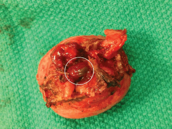 Figure 1: Surgically excised cervical stump revealing a large tortuous vessel (white circle) at the cut surface