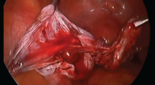 Figure 2: Traction-counter traction being used for separating the cyst wall from the ovarian cortex.