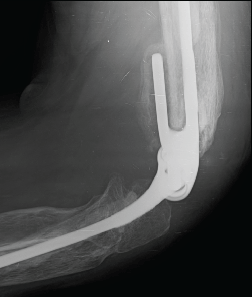 In order to exclude possible infection, we monitorized the C-reactive protein levels, which decreased gradually. Two months later, the X-ray and the Computed Tomography showed signals of malunion (Figure 3) and the external fixator was removed. In the postoperative period we noticed an important elbow instability and reduced mobility. We considered multiple treatment options and concluded that internal fixation would not be possible given the absence of adequate articular surfaces. In this sense, we decided to perform a total elbow arthroplasty three months after the accident. By a posterior approach, the triceps was externally reflected, the distal humeral extremity was regularized, the bone sequestra were removed and the ulna was prepared. A linked arthroplasty was applied - Coonrad-Morrey total elbow arthroplasty. The extensor apparatus was inserted directly over the prosthesis (Figure 4). Ulnar nerve transposition was not necessary.
