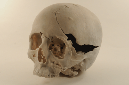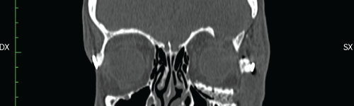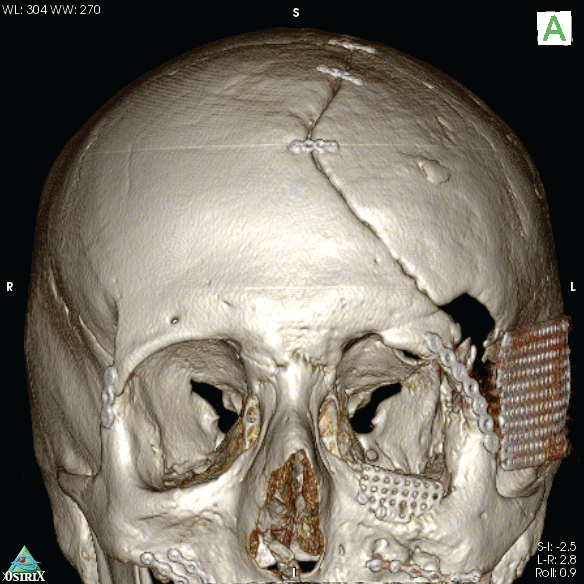 Due to a high-energy motorcycle accident, a male 21 year-old patient suffered frontal anterior cranial vault injuries and skull and pan-facial fractures. He was hospitalized at the local trauma centre and an immediate emergency neurosurgical intervention was performed to reduce the high intracranial pressure level, temporarily removing part of the left parietal and temporal bones and definitively the more comminuted bone fragments from the left orbital rim and roof. When stabilized, a second surgical intervention was performed to practice the cranioplasty, reapplying the previously removed cranial vault bones and to reduce the frontal bone and zygomatic fractures; supraorbital rim comminuted fracture was reconstructed with homologous cadaveric frozen bone; orbital floor defect was sealed with Ethisorb® Dura Patch membrane and the maxillo-zygomatic process was reduced on the left side. Reduction of frontal bone and zygomatic fracture, orbital floor and medial orbital wall reconstruction were also performed on the right side. Despite the treatment, ocular dystopia and severe mid-facial asymmetry with left orbital deformity remained due to the lack of the left orbital floor bone and the presence of still wide missing bone defects (Figure1).