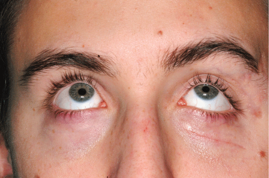 At the time, the best corrected visual acuity was 20/20 in both eyes. The ophthalmological examination proved to be unremarkable. Orthotic evaluation was notable for an 8 prism dioptres (PD) left eye esotropia and 4 PD hypertropia. The patient suffered from oblique diplopia for near and distance. A prismatic prescription of 7 PD bases 350 was necessary to obtain binocular single vision in primary position. The vertical squint worsened on downgaze, due to left eye inferior rectus and superior oblique muscles under-action with infraduction impairment. An abnormal head posture with chin depression was observed.