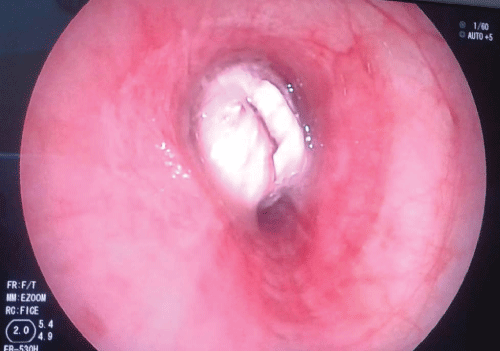 We report a case of a previously healthy 29-year-old male who experienced a severe traumatic brain injury with right temporal extracerebral intracranic hematoma and splenic injury after massive trauma sustained after a car accident. The patient was on his bike, he missed a red traffic light, and a car invested him and threw him 4 meters away. In the prehospital setting, the patient was found with GCS 3, with pupils equals, round and reactive to light with good hemodynamics. The medical emergency team who operated on the scene found difficulty in providing advanced airway management. The patient arrived in the emergency department with GCS 7 (E1, M5, V1,) without alteration of the pupil size, ventilated with bag-mask, hemodynamically stable but with metabolic acidosis (BE - 4, 4; lat 0.6) and poor respiratory exchanges (Pa02/Fi02: 135); he was promptly intubated without any difficulty and ventilated mechanically. The cerebral CT scan found a right fronto-temporal sphenoid fracture, a right temporal extracerebral intracranic hemorrhage of 16 mm that compressed the lateral ventricle; the abdominal CT scan revealed an intraparenchymal lesion of the medial part of the spleen. The thoracic CT scan revealed in the main left bronchus a round object of an unknown nature that occupied the entire origin of the left superior pulmonary lobe. The injury severity score was calculated to be 36 and the patient was brought to the operating room for a splenectomy and for a temporal craniotomy with drainage of the extracerebral intracranic hemmorrhage and the positioning of an intraparenchimal probe for intracranial pressure monitoring. In consideration of presence of an unknown object in the lower airway, documented by CT scan, a flexible fiberoptic bronchoscopy (FOB) was performed in presence of hemodynamic, respiratory and cerebral perfusion stable conditions. A white round object was visualized within the main left bronchus completely occupying the origin of the superior left bronchus (Figure 1). The removal of the foreign object was attempted with a Dormia basket® which was advanced beyond the unknown object, opened and closed around the object. The basket with the object and the endotracheal tube were removed together and rapid sequence re intubation was performed immediately without complications. After recruitment maneuvers and adequate ventilation, respiratory exchange progressively improved. The white round object was delivered to the police who analyzed it and identified it as a packet of cocaine. The clinical and laboratory data documented absence of cocaine intake. He was extubated two days after surgery and was subsequently discharged from ICU without complications after three days.