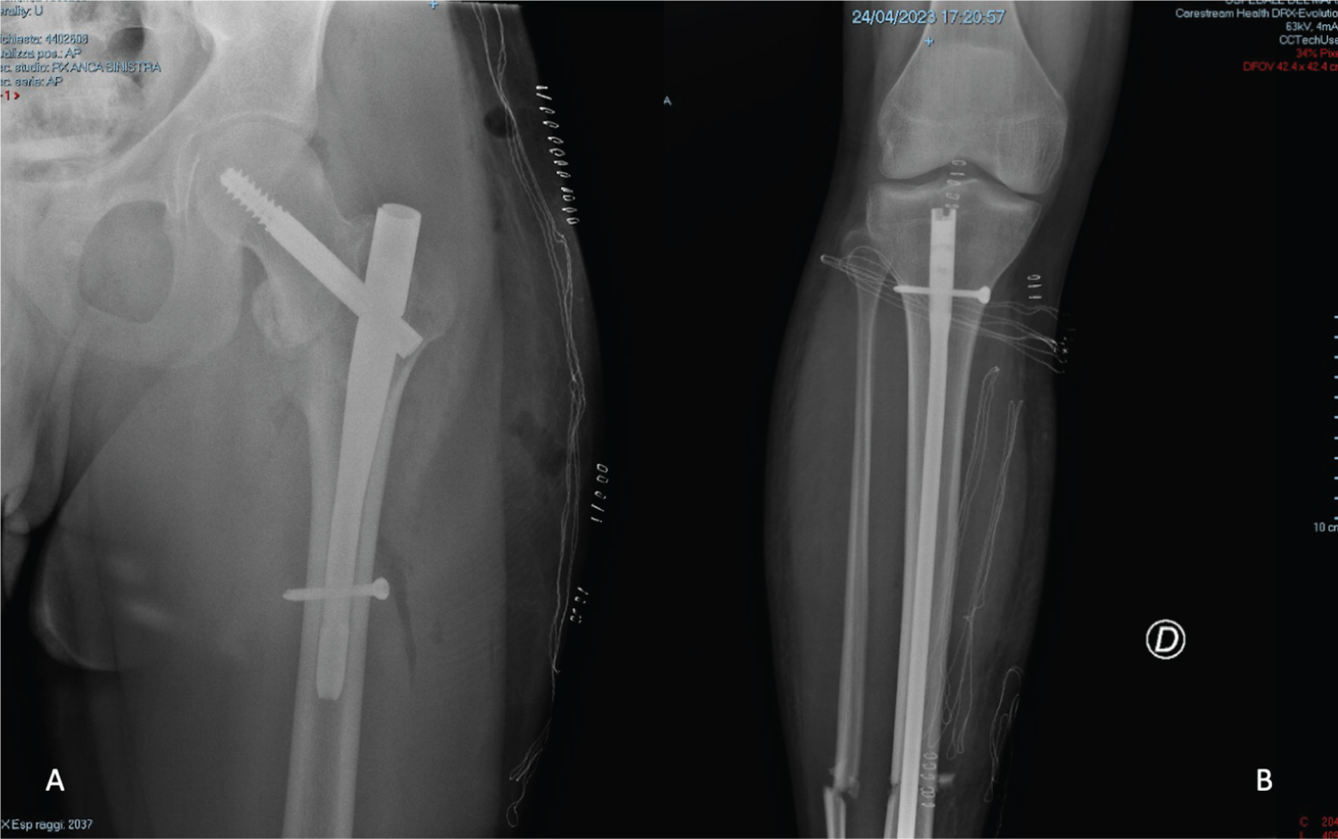 A 20-years-old male was admitted to our emergency department for a road car accident with a diagnosis of bilateral lower extremities fractures (tibial shaft fracture and femoral neck fracture. After six hours he underwent a surgical intervention of endomedullary nailing for both fractures (Figure 1). Before surgery, this patient was conscious at all times but 24 hours after surgery, he manifested state of confusion, with episodes characterized by delusional ideation, confabulation and psychomotor agitation. On neurological physical examination, the patient was alert, disoriented in time, cranial nerves appeared uninjured, and there were no focal limb signs. Brain CT scan and electroencephalogram showed no abnormalities. Due to the persistence of the symptomatology, MRI of the brain was performed, which showed multiple, millimeter-long areolae of pathological signal restriction in DWI study sequences at the bilateral nucleocapsular region, corona radiata, deep white matter and juxtacortical on both sides as well as at the posterior frontal cortical site. Additional similar areas were found at the posterior median and paramedian right commissural region and at bilateral retro trigonal site. These findings were compatible with multiple embolic-based ischemic foci in an evolving phase (Figure 2). There is no specific treatment for fat embolism or fat embolism syndrome. Therapy included prophylaxis stroke with aspirin at a daily dose of 100 mg, Low Molecular Weight Heparin (LMWH) 4000 IU once day and Dexamethasone 4 mg intravenous twice daily. After one day, the patient appeared markedly improved, alert, conscious and cooperative, oriented in time, with fluent speech, normal pupillary reflex, preserved strength, sensitivity and coordination, absent meningeal symptoms. The patient during hospitalization practiced echocardiographic "bubble-test" with evidence of suspected atrial septal defects (ASDs) at the level of the caval septum with left-to-right shunt and passage of microbubbles of moderate entity. Transesophageal echocardiography could not be performed because of the patient's difficulty in lying lateral decubitus. After 10 days, the patient repeated brain MRI that showed attenuation of known ischemic lesions (Figure 3).