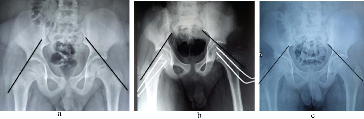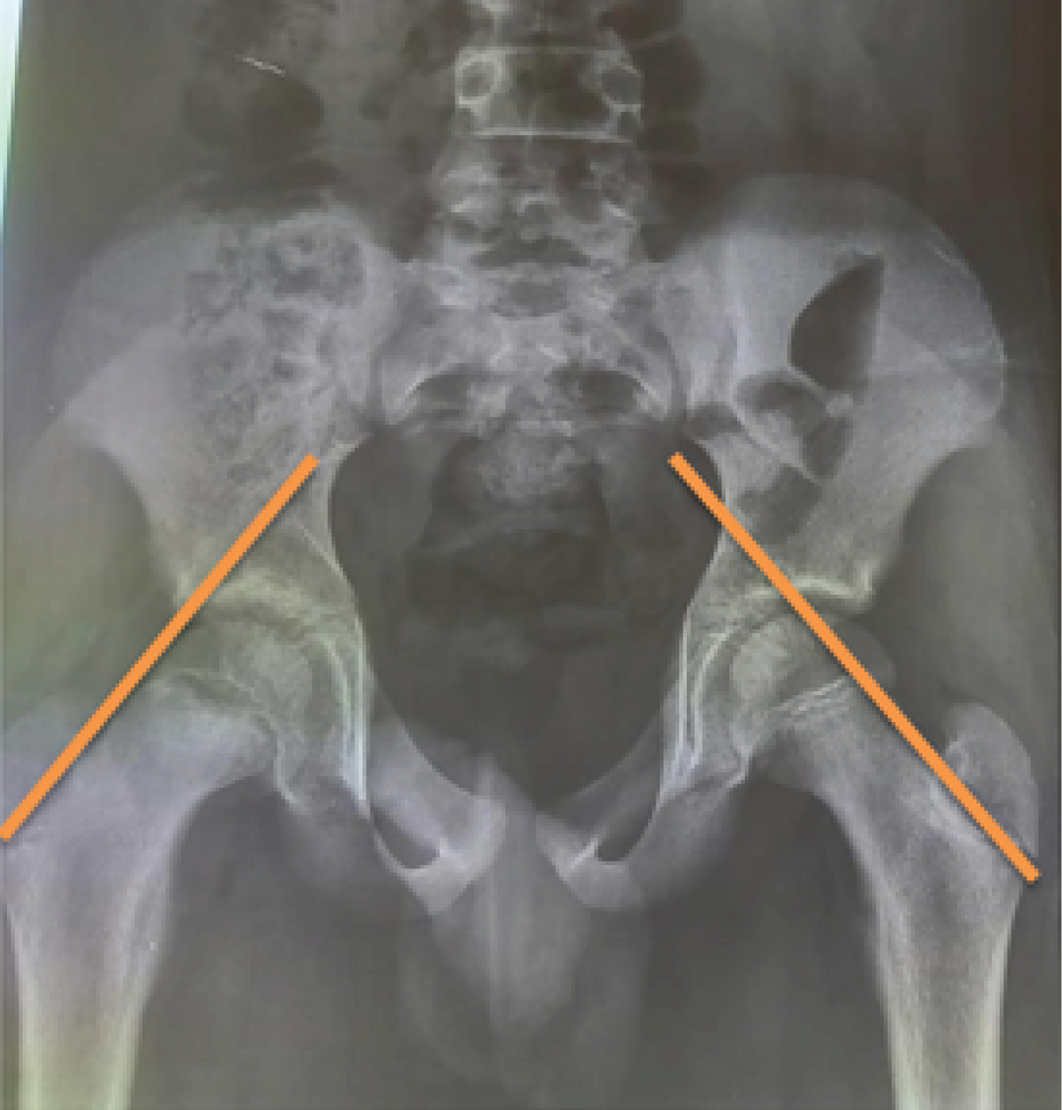 This was a four-year retrospective descriptive study, from January 1, 2017 to December 31, 2020. All patients with upper femoral epiphysiolysis (EFS) treated by simple pinning or percutaneous screw fixation with a postoperative follow-up of at least six (6) months were included. The diagnosis of EFS was established on clinical and paraclinical grounds following a consultation. X-rays of the pelvis and profile enabled us to classify the degree of slippage according to Carlioz. Follow-up was clinical and paraclinical, enabling us to assess post-treatment evolution with a view to detecting and treating complications. On each patient's pelvic X-ray, we determined Klein's line (Figure 1), which is the tangent to the upper edge of the neck, no longer passing through the upper edge of the superior ossification nucleus. On the strict profile X-ray, we traced the SOUTHWICH angle (Figure 2).