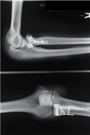 If a fracture can be anatomically reconstructed and afterwards is functionally stable, ORIF is a possible treatment option [27]. In our centre, ORIF is always performed in combination with treating associated injuries, including the reconstruction of ligament injuries or coronoid fractures. The goal is any case to achieve a functionally stable joint with the possibility of early mobilization [27,28].