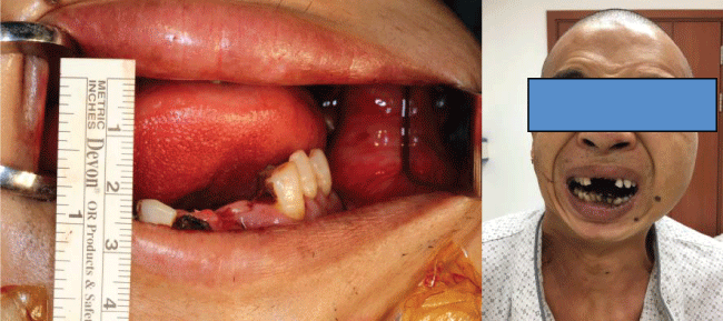 Figure 1: The patient have no movement of his mandibular, completely restriction in opening mouth, bird face, malocclusion, bad oral hygiene.