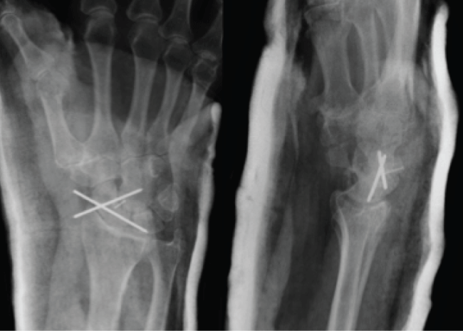 At last review 12 months after the injury the patient had a pain free wrist with flexion of 50 degrees, extension of 60 degrees, pronation of 80 degrees, supination of 80 degrees. Subjectively the patient had returned to his premorbid level of function
